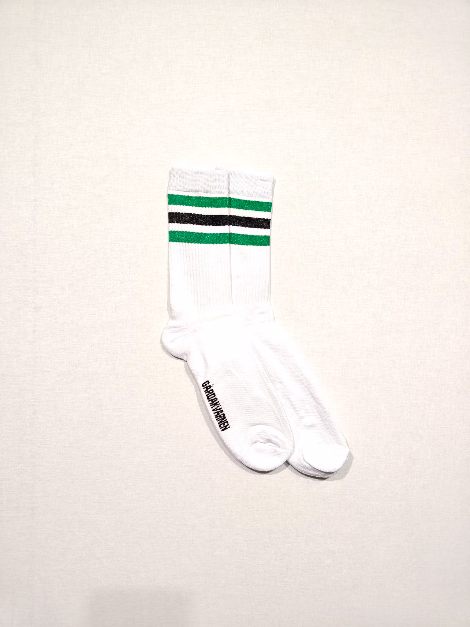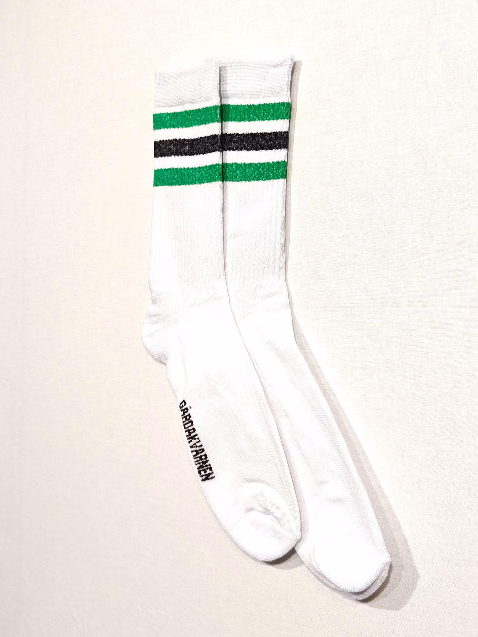 I lager. Antal: Strumpor: Stripes 59 kr Storlek 35-38, 1-pack 39-42, 1-pack 43-46, 1-pack Lägg i korgen Leverantör: Sportstrumpor i vitt med grönsvarta ränder och GÅRDAKVARNEN på sulorna.